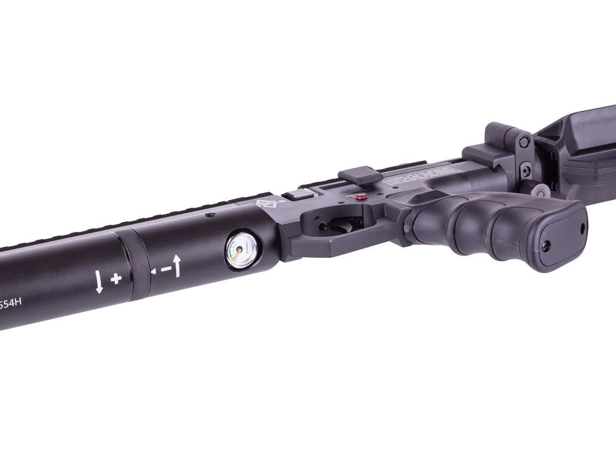 It comes in three popular calibers, .177, .22, or .25 with the ability to change barrels. Swapping to a different caliber barrel (sold separately) is quick and simple and takes less than five minutes. Changing velocity and power is easy thanks to the external regulator and hammer spring adjustments that allow you to dial in downrange performance. Energy in .177 caliber is 15 FPE, in .22 it is 27 FPE, and in .25 it is 30 FPE depending on the projectile and adjustment settings.