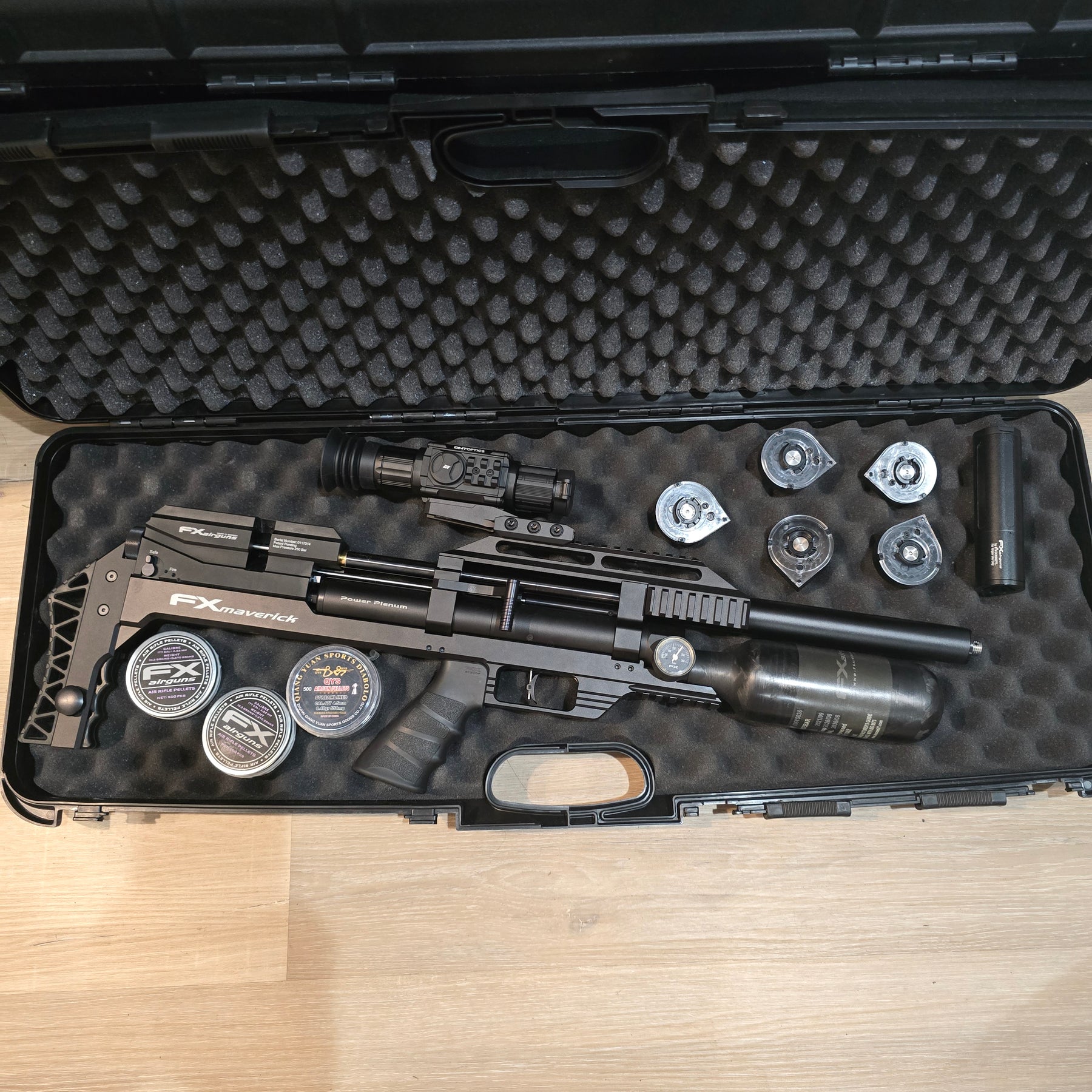 The extremely accurate FX Maverick Compact .177cal Tuned (10gr pellets at 900fps) topped with a DNT Zulus 3-12x Day / Night scope!