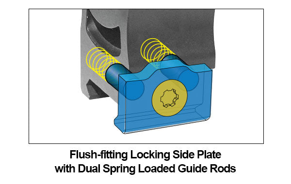 a) Flush-Fitting Low Profile Steel Locking Side Plate Controlled by Dual Spring-Loaded Guide Rods for Easy Installation